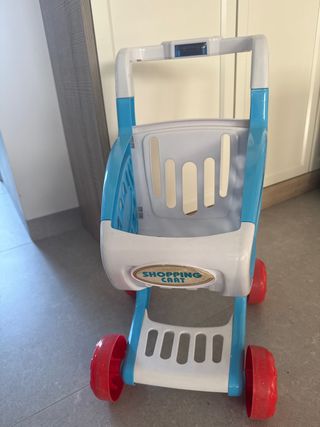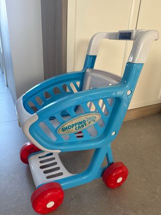 Carro de la compra de juguete, ideal para que los más pequeños jueguen a hacer la compra. - Color azul y blanco. - Ruedas rojas. - Con la inscripción SHOPPING CART.