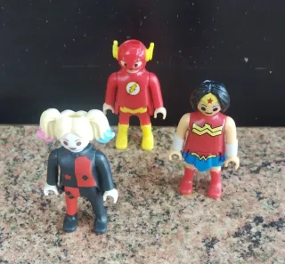 Lote de tres figuras de Playmobil inspiradas en superhéroes. - Figura de Wonder Woman. - Figura de Flash. - Figura de Harley Quinn.
