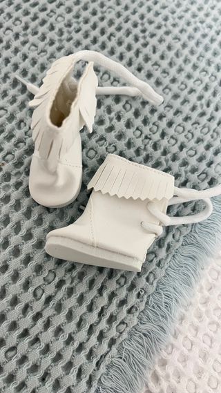 Preciosas botas blancas para muñeca, con un diseño de flecos y cordones. La suela mide 5cm - Color: Blanco - Diseño: Flecos - Cierre: Cordones