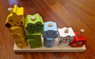 Juguete de construcción de madera con temática de animales. - Piezas de madera pintadas con colores vivos. - Incluye figuras de animales como cocodrilo, cebra y loro. - Base de madera para apilar las piezas.