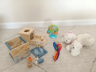 Conjunto juguetes:. - Caja permanencia Montessori de madera y bola de madera sin barnices, con señales de uso que no afectan a su funcionamiento. - Cubo de actividades con temática marina y cuentas. Tiene un lateral suelto, lo que hace que la parte de arriba caiga por un lateral, pero se puede arreglar ajustando tornillos, por lo demas en perfecto estado de conservación. - Cinta Waldorf de colores, nueva a estrenar. -Noria musical VTech prácticamente sin uso y se entrega con pilas. - Peluche de gato y osito pequeño sin uso. *El cubo de actividades tiene lateral suelto que se puede ajustar con tornillos