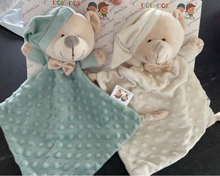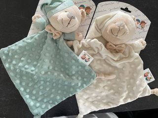 Doudou o mantita de apego de la marca Gamberritos para bebés. Son muy suaves y agradables al tacto. - Incluye dos doudous. - Uno en color verde menta con topitos. - Otro en color crudo con topitos. - Ambos con un osito y un lazo. Estàn nuevos sin usar. 10 euros los dos.