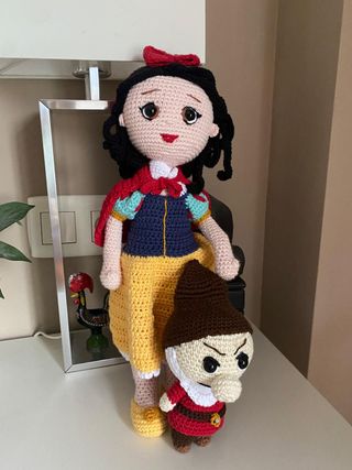 Set de figuras amigurumi de Blancanieves y Gruñón, personajes icónicos. - Blancanieves con vestido amarillo y capa roja. - Gruñón con gorro marrón y traje rojo. Blancanieves: 30 euros Gruñon: 15 euros Juntos: 40 euros