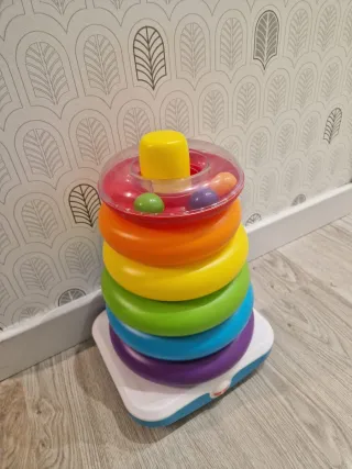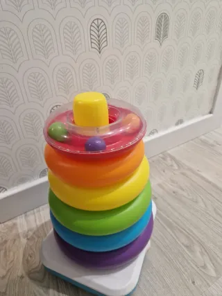 Juguete clásico Fisher-Price para apilar anillos. - Base cuadrada. - Anillos de colores: morado, azul, verde, amarillo, naranja y rojo. - Parte superior transparente con bolitas efecto sonajero. - Palo amarillo en la parte superior.