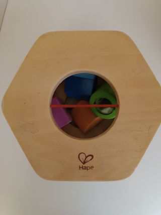 Se vende precioso juguete encajable de madera de la marca Hape. Es un juguete ideal para desarrollar la motricidad fina y el razonamiento espacial. - Hecho de madera. - Diseño hexagonal. - Incluye piezas de diferentes formas y colores. - Todas las piezas por dentro llevan bolitas y hacen diferentes sonidos
