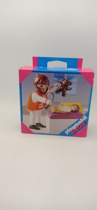 Vendo Playmobil serie especial 4623 Pediatra con Bebe Totalmente nueva sin abrir. Incluye todo lo que se ve en la foto. La caja tiene un pequeño arañazo en una esquina - Figura de doctor con estetoscopio. - Figura de paciente. - Figura de osito de peluche. - Cama de paciente.