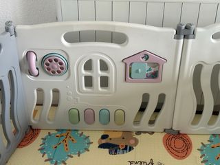 Corralito infantil con paneles de juego interactivos. - Panel con teléfono de juguete. - Panel con ventana y puerta de casa de juguete. - Panel con teclas de piano de juguete. - Diseño de plástico resistente y seguro.