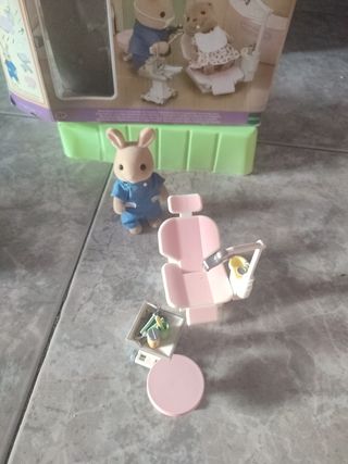 Set de dentista de Sylvanian Families. - Incluye figura de conejito con uniforme. - Sillón de dentista rosa. - Bandeja con instrumental dental.