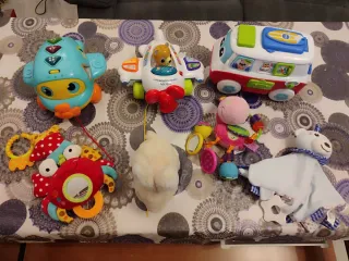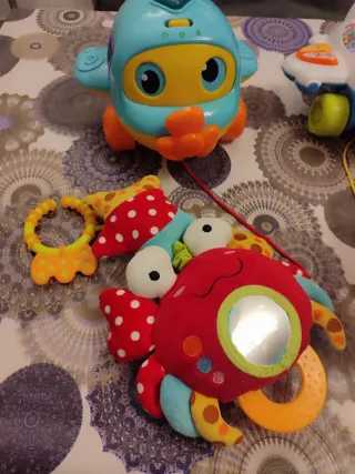 Lote de juguetes para bebé, ideal para estimular el desarrollo. - Todo lo que va a pilas, funciona perfectamente. - Juguete con forma de avión en tonos azules y naranjas. Le falta la tapa de detrás y las piezas que entran por los huecos. - Cochecito de juguete con ruedas y detalles coloridos. - Cangrejo de peluche con sonajero y espejo. - Peluche de conejito. - Juguete interactivo con diferentes texturas y colores. - Peluche de oso con manta.