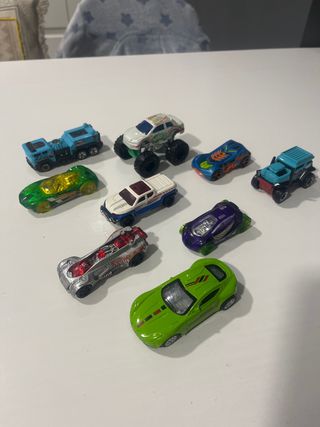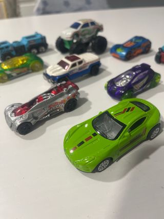 Lote de 14 vehículos de juguete variados. - Incluye coches deportivos, camiones y aviones. - Colores surtidos como rojo, azul, amarillo y blanco.