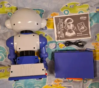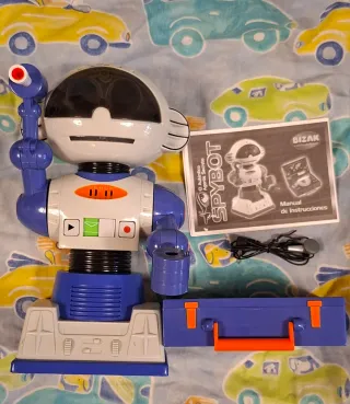 Robot interactivo Spybot de Bizak, el original del 2002, diseñado para la diversión y el juego. - Incluye manual de instrucciones. - Viene con un micrófono. - Se acompaña de un maletín de transporte azul con detalles naranjas. Funciona perfectamente. Movimiento en todas la direcciones, la linterna el modo silencioso, la alarma de intrusos y la grabadora de sonidos. Con manual de instrucciones original impecable. Muy poco uso. Estéticamente muy bien. No le falta nada.