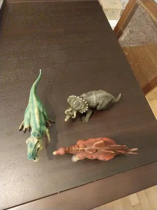 Conjunto de tres figuras de dinosaurios de juguete, perfectas para coleccionistas o para jugar. - Dinosaurio verde con detalles realistas. - Triceratops gris con cuernos. - Dinosaurio rojo con placas dorsales.