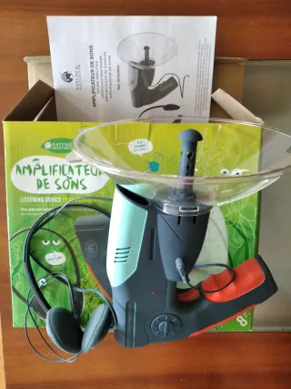 Amplificador de sonidos de la marca Nature & Découvertes, con auriculares incluidos. El dispositivo tiene un diseño ergonómico y un plato recolector de sonido. Juego de experimentación de sonidos de la naturaleza como pájaros. - Incluye auriculares. - Plato recolector de sonido. - Diseño ergonómico.