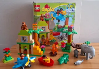 Set de construcción Lego Duplo Alrededor del Mundo - Jungla. Se incluyen todas las piezas. Completo: figuras de animales elefantes, tigre, mono y cocodrilo, personajes, un avión, un barco y elementos de construcción para crear la jungla. Ideal para fomentar el juego creativo y el aprendizaje sobre animales.