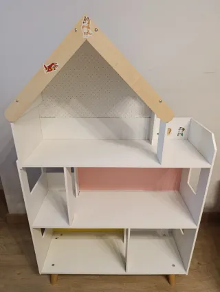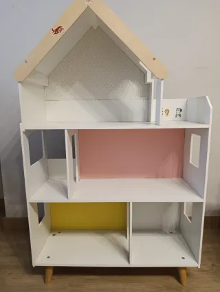 Encantadora casa de muñecas de madera con un diseño moderno y colorido. - Estructura de madera blanca. - Techo a dos aguas. - Paredes interiores en rosa y amarillo. - Patas de madera para soporte. Medidas: 128 de alto 79 de ancho 30 de fondo
