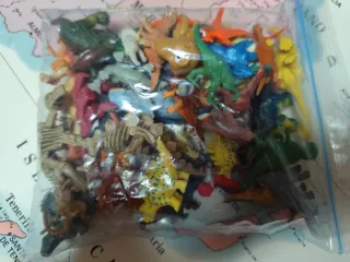 Lote de mini juguetes de dinosaurios de plástico. - Variedad de dinosaurios y esqueletos. - Segunda foto. Bolsa que incluye pequeños muñecos. - Ideal para coleccionar o jugar. - Precio por bolsa