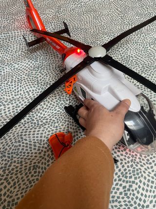 Helicóptero de juguete grande con temática de rescate aéreo. Incluye una camilla. -Luz y sonido - Helicóptero blanco y rojo. - Detalle Air Rescue en el lateral. - Camilla naranja con cuerdas negras.