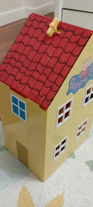 Casa de juguete de Peppa Pig con tejado rojo y paredes amarillas. SE VENDE PORQUE ESTÁ EN BUEN ESTADO - Ventanas cuadradas con marcos blancos. - Puerta en la pared lateral. - Detalle de Peppa Pig en la pared.