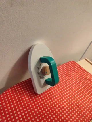 Set de plancha y tabla de planchar de juguete, fabricado en madera. - Diseño infantil con estampado de lunares rojos. - Estructura de madera plegable.