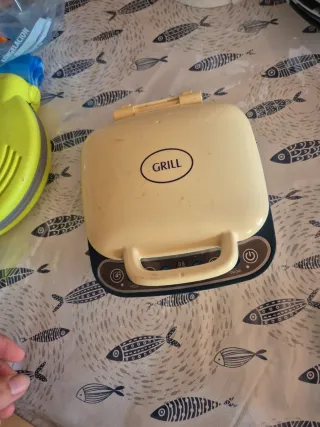 Grill de juguete con diseño divertido. - Color crema y base azul. - Asa para transportar. - Botones de control.
