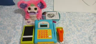 Lote de juguetes que incluye una caja registradora, un peluche y accesorios. - Caja registradora Just Like Home en color azul y amarillo. - Peluche rosa con detalles morados y verdes. - Escáner de juguete naranja. - Tarjeta de crédito/débito de juguete.