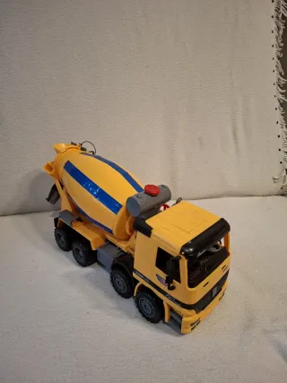 Camión hormigonera de juguete de color amarillo con detalles en azul. - Tambor giratorio. - Escalera de acceso. - Ruedas todoterreno.