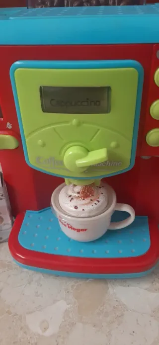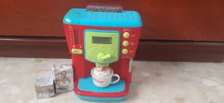 Cafetera de juguete con pantalla, sonido y luces. - Pantalla que muestra Cappuccino, latte, macchiato. - Botones de funciones de sonidos y luces. - Tiene un depósito de agua que puede llenarse y entonces sale el agua para la taza. Está opción no la hemos usado, funciona, pero no la usamos. - Incluye taza y accesorios, los de cartón están usados, ver foto. Otros juguetes de accesorios de cocina en mi perfil, puedo hacer lotes. Infantil, juvenil, niños, niñas.