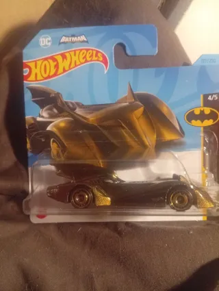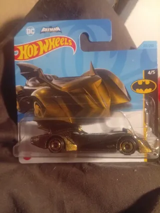Coche de colección Hot Wheels de Batman en color dorado. - Diseño inspirado en el Batmóvil. - Escala 1:64. - Parte de la serie 5/5.