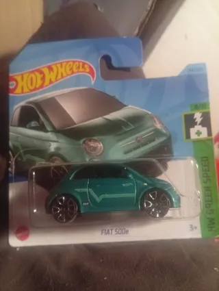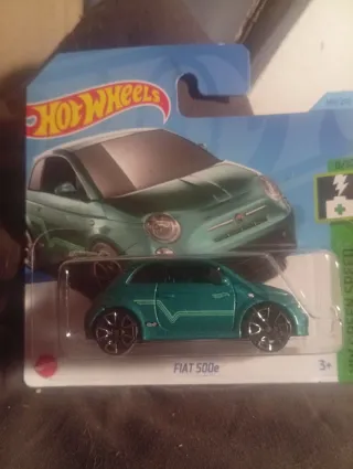 Coche de juguete Hot Wheels del modelo Fiat 500e. - Color verde metálico. - Diseño deportivo con detalles en blanco. - Ruedas negras. - Escala 1:64.