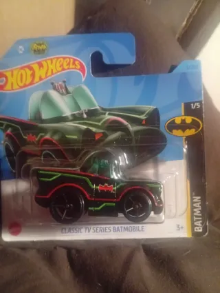 Coche de colección Hot Wheels. - Modelo: Batmobile Classic TV Series. - Diseño inspirado en la serie de televisión. - Color principal negro con detalles en verde y rojo. - Logo de Batman en el lateral.