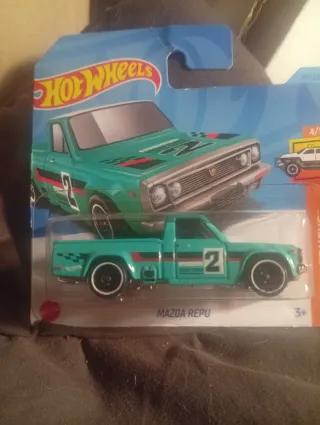 Coche de juguete Hot Wheels, modelo Mazda REPU. - Color azul con detalles en negro y rojo. - Número 2 en la puerta y capó. - Diseño tipo camión. - Parte de la colección HW Hot Trucks.