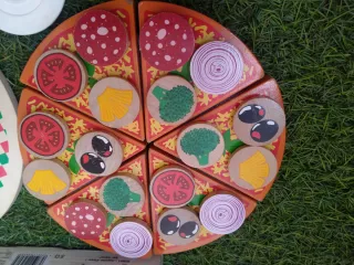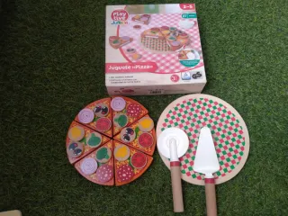 Set de juego de pizza de madera. - Incluye base de pizza, cortador y espátula. - Piezas de madera natural. - Diseñado para fomentar la creatividad. Se vende con su caja original. Ideal para regalar