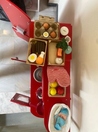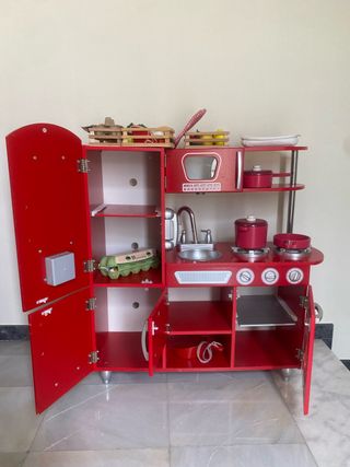 Divertida cocina de juguete de color rojo para los más pequeños. Incluye varios accesorios para jugar. - Cocina de madera. - Utensilios incluidos.