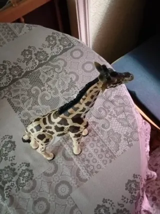 Figura de jirafa con manchas marrones y blancas. - Diseño realista. - Patas detalladas. - se abren las patas y baja la cabeza. Le falta un poquito de la lengua