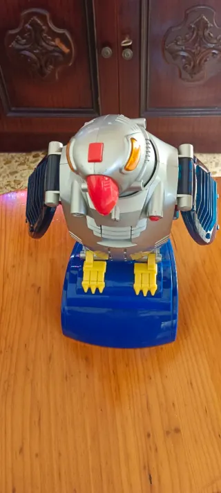 Este es un juguete de loro robot de estilo vintage. Su diseño combina colores plateados, rojos y azules con detalles amarillos. - Hace sonidos ,grava y escuchas lo grabado,mueve la cabeza y se encienden los ojos