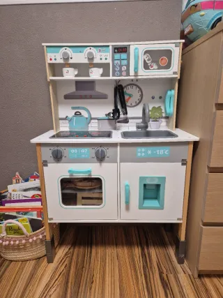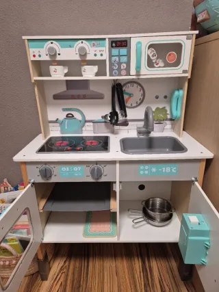 Divertida cocina de juguete de madera, ideal para que los más pequeños desarrollen su imaginación. Tiene pegatinas. - Diseño moderno en blanco y turquesa. - Incluye accesorios como tetera, platos y utensilios. - Horno con puerta abatible y microondas. - Pila y grifo. - Compartimento para nevera.
