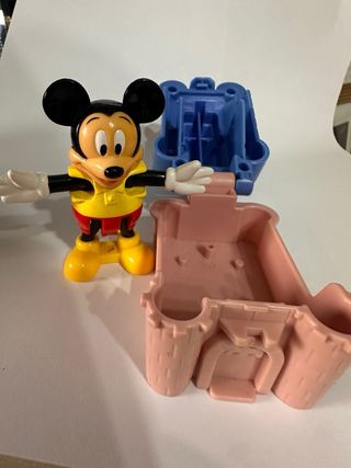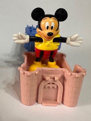 Figura de Mickey Mouse con un castillo de juguete. - Mickey Mouse con su icónico traje amarillo y rojo. - Castillo de color rosa con detalles de ladrillos y puerta. - Base azul en la parte trasera del castillo.