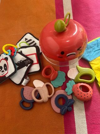 Conjunto de varios juguetes para bebé, ideales para estimular el desarrollo. - Incluye peluches, sonajeros y mordedores. - Diseños coloridos y variados. - Materiales aptos para bebés. Hay juguetes de sonido que funcionan perfectamente