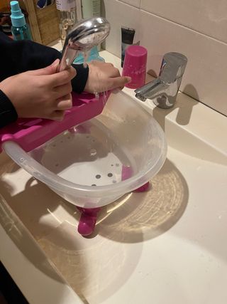 Divertido cambiador y bañera para muñecos Nenuco. Incluye accesorios. - Bañera con ducha. - Cambiador con compartimentos. - Cuna colgante. - Corralito. - Accesorios de higiene.