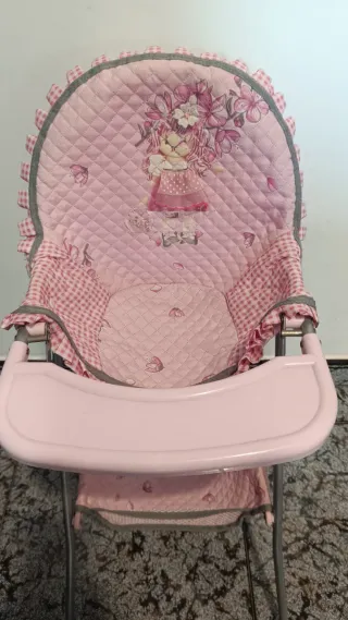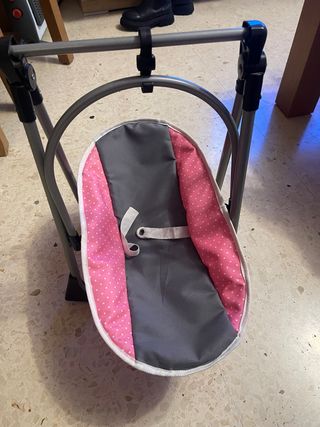 Mecedora y cuna de juguete para muñecos o bebés. - Estructura metálica. - Asiento acolchado con estampado de lunares rosas y grises. - Incluye cinturón de seguridad.