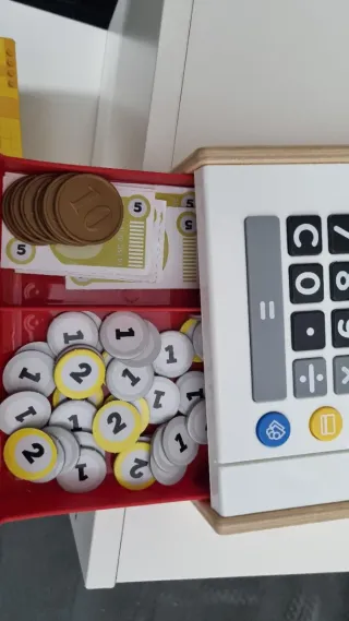 Calculadora juguete ikea completada con monedas y billetes con los que los kilos pueden jugar y calcular simulando comprar y vender.