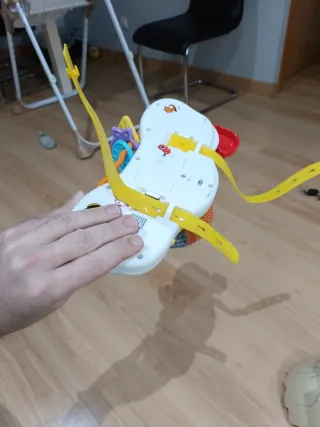 Divertido teléfono de juguete con forma de perro para los más pequeños. Ideal para estimular el aprendizaje y la diversión. - Diseño de perro amarillo. - Teclado numérico con botones de colores, los números están pintados con un permanente porque se borraron. - Auricular azul con notas musicales. - Correa amarilla para colgar. - Tiene un montón de canciones y sonidos además de luces que se reflejan en el techo o en la pared ideal para la estimulación del bebé.