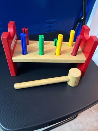 Juguete de madera para martillar con clavijas de colores. - Base de madera. - Estructura roja. - Clavijas de plástico en azul, verde, amarillo y rojo. - Incluye martillo de madera.