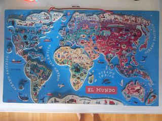 Original puzzle de madera imantado del mapamundi de la marca Janod. Ideal para aprender geografía de forma divertida. En la esquina, por la parte de atrás, está un poco rozado como se ve en la imagen. De ahí su precio. - Piezas de madera con relieve. - Ilustraciones coloridas de animales y monumentos. - Incluye los nombres de países y océanos.