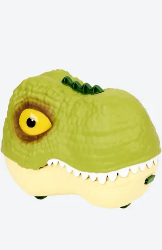 Maleta transporta juguetes con forma de cabeza de dinosaurio en color verde. - Con dinosaurios en el interior - Ojos grandes y expresivos. - Con luz y sonido. - Dientes blancos. - Detalle de crestas en la parte superior.