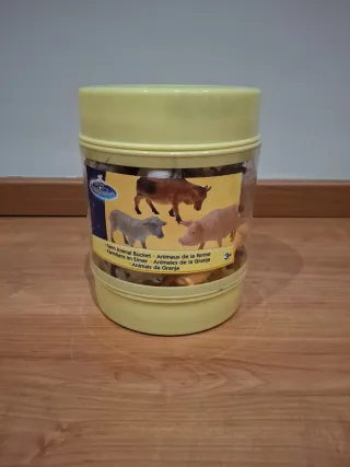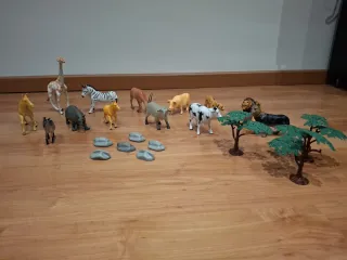 Set de figuras de animales de la sabana y la granja. - Incluye jirafa, cebra, león, vaca, hipopótamo, cabra, toro y más. Piedras y árboles - Ideal para coleccionar o jugar. Incluye cubo