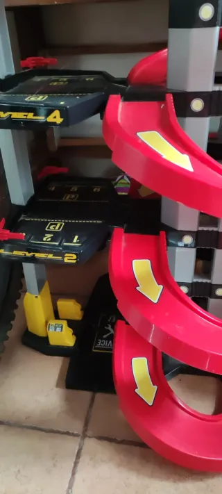 Parking de juguete con 5 niveles y rampas en espiral. - Torre central con detalles. - Rampas de color rojo con flechas. - Niveles marcados con números.