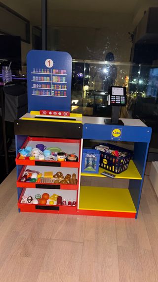 Divertida caja registradora de juguete de la marca Lidl, perfecta para que los más pequeños jueguen a las tiendas. - Incluye accesorios como tazas, platos, comida de juguete y cesta de la compra. - Diseño colorido y atractivo. - Fabricada en madera y plástico.