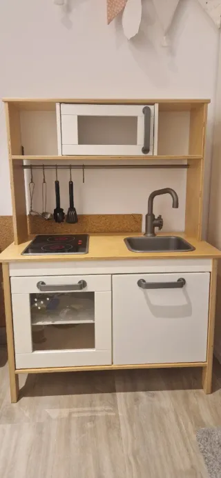 Cocinita de madera, abedul. Modelo DUKTIG de IKEA, ideal para que los más pequeños jueguen a ser chefs. - Encimera de madera con vitrocerámica y fregadero. - Microondas integrado en la parte superior. - Armario inferior con puerta y estante. - Medidas 72x40x109 cm - Incluye accesorios de cocina, platos, tazas de ceramica y una cesta con fruta, verdura otros alimentos.