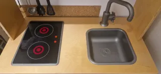 Divertida cocinita de juguete de madera, ideal para los más pequeños. - Diseño moderno y colorido. - Incluye horno, vitrocerámica y fregadero. - Estanterías para almacenar accesorios. - Reloj decorativo. Está en muy buen estado. La entregamos ya montada.